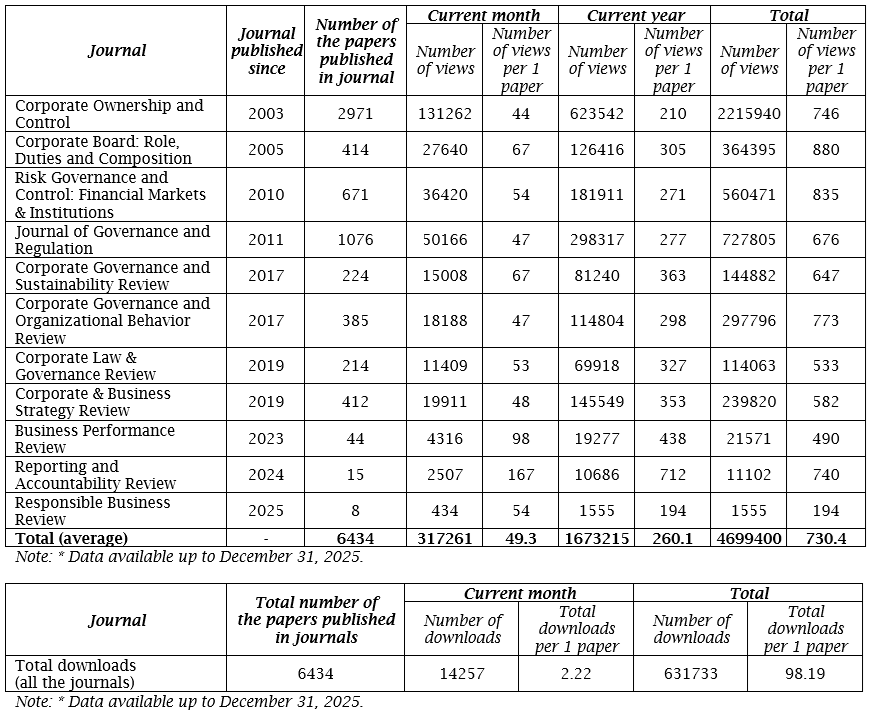 The editorial team of Virtus Interpress is honoured to introduce the report on the main indicators of our Virtus Scholar Statistics Platform for December 2025. This platform provides the key statistical data of the papers published in our journals. We consider that the researches are to be shared freely in the scholarly sphere. It is an important factor for our authors with regard to the paper’s citation, views and readability, etc. Also, this will enable the theoretical results to be practically applied in corporate governance. Our Platform Statistics is a part of our open access policy.