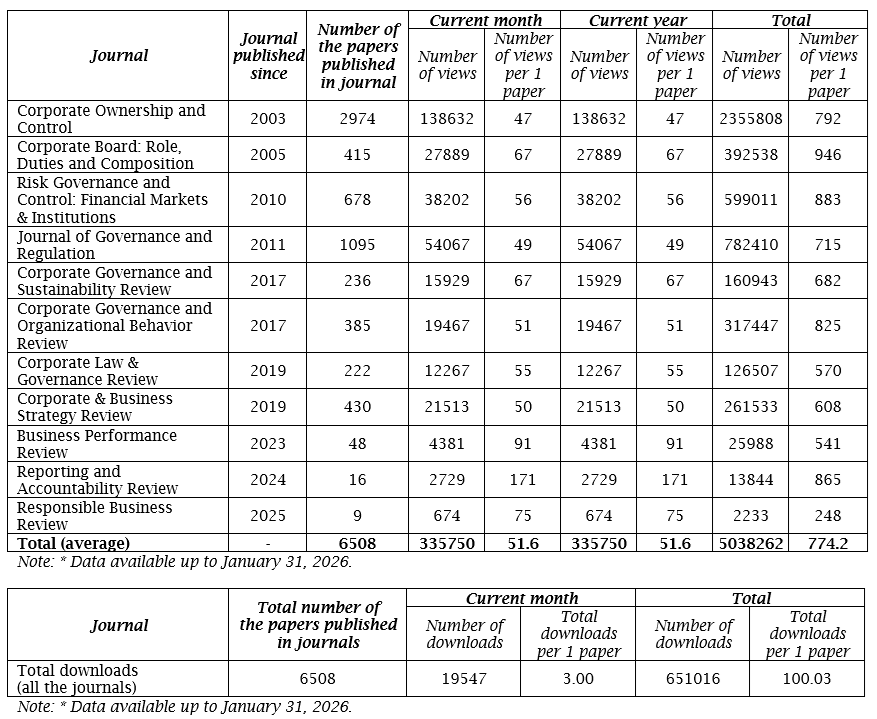 The editorial team of Virtus Interpress is pleased to present the report on the main indicators of our Virtus Scholar Statistics Platform for January 2026. This platform provides the key statistical data of the papers published in our journals. We consider that the researches are to be shared freely in the scholarly sphere. It is an important factor for our authors with regard to the paper’s citation, views and readability, etc. Also, this will enable the theoretical results to be practically applied in corporate governance. Our Platform Statistics is a part of our open access policy.