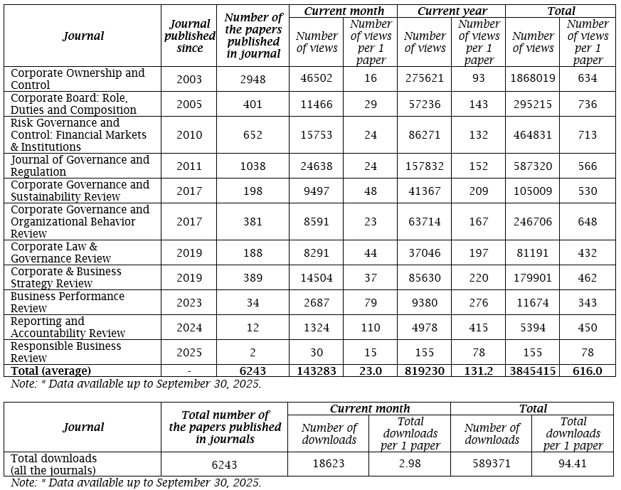 The editorial team of Virtus Interpress is glad to present the report on the main indicators of our Virtus Scholar Statistics Platform for September 2025. This platform provides the key statistical data of the papers published in our journals. We consider that the researches are to be shared freely in the scholarly sphere. It is an important factor for our authors with regard to the paper’s citation, views and readability, etc. Also, this will enable the theoretical results to be practically applied in corporate governance. Our Platform Statistics is a part of our open access policy.